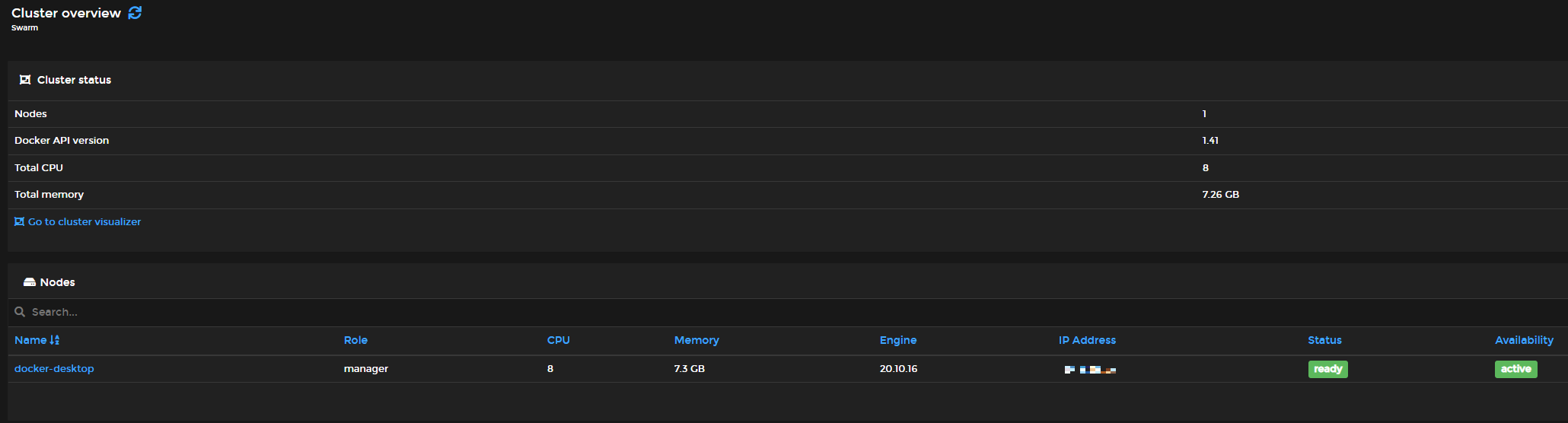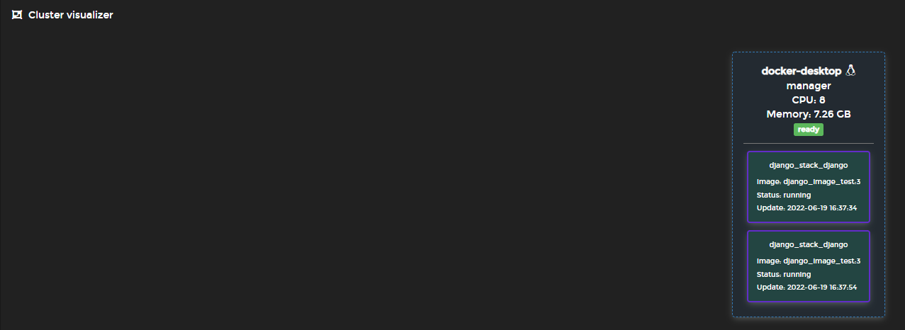 그리고 go to cluster visualizer에 들어가보면 swarm에 어떤 node들이 구동하고 있는지 볼 수 있다.