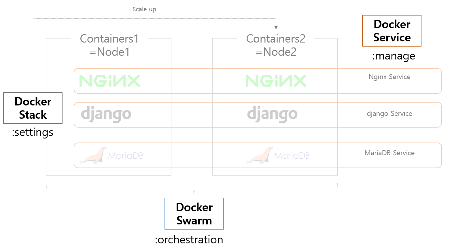 이렇게 scale up되어 여러 container들이 묶인 하나의 서버를 Node라고 부른다. 그리고 이런 Node가 여러 개 모여서 관리되는 것을 Docker Swarm이라는 개념으로 정의한다.