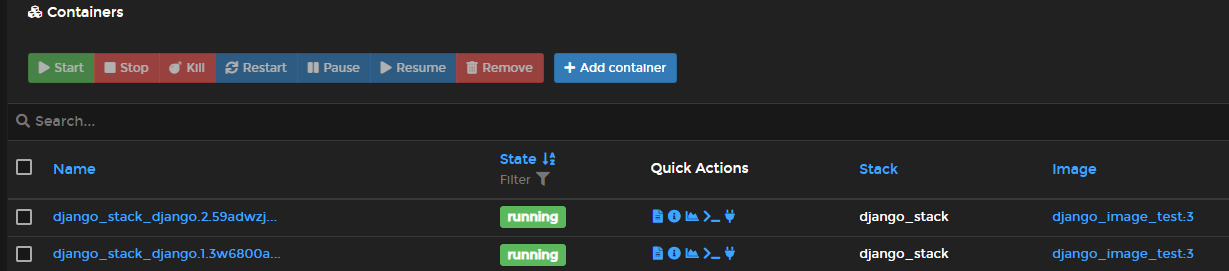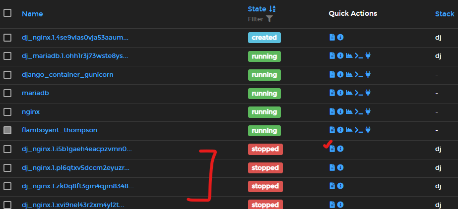 각 Stack, Services, Containers가 정상적으로 생성되었다. 혹시 container가 Stopped State로 여러 개 생성된다면 그것은 container 생성 순서 때문일 수 있다. mariaDB container -> django -> nginx 순서대로 각 container의 base가 되는 container가 생성되야만 그 다음 container가 생성될 수 있는 구조이다. 그런데 예를 들어 docker가 nginx container 부터 생성하여 기반이 되는 django container 연결정보를 못찾는다면 해당 nginx container는 Stopped되고 새로운 nginx Container를 만들면서 다시 django container와 연결을 시도하는 방식이기 때문이다. Stopped된 container가 있다면 "Quick Actions"의 맨 왼쪽, Log 아이콘을 눌러서 무슨 문제가 있었는지 확인해보는 것이 좋다.