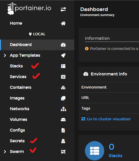 이제 해당 node의 portainer로 접속하면(새로고침) 기존에는 없던 Stacks, Services, Secrets, Swarm이라는 메뉴가 추가로 생성된 것을 볼 수 있다.