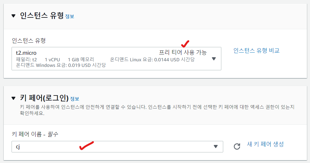 인스턴스 -> 인스턴스 시작 -> Ubuntu Server 20.04, 프리티어 사용가능으로 선택, 상기 생성하였던 키페어로 인스턴스를 시작한다.