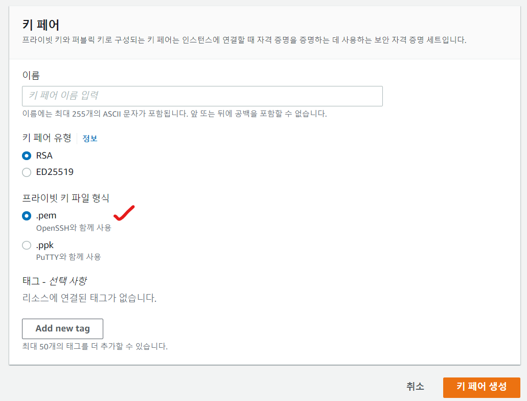 aws는 ID/PW 방식 외 키페어 방식을 통해 보안 설정을 한다. 맨 먼저 키 페어를 생성해본다.