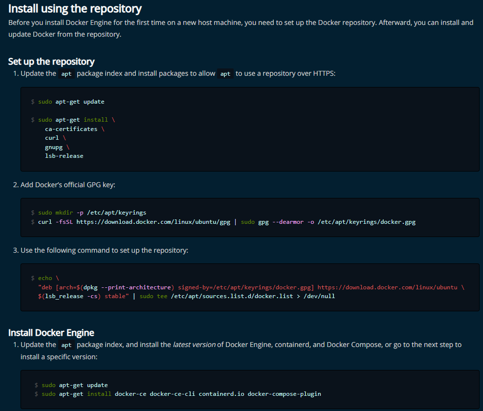 링크에서 시키는대로 쭉... 해준다. Set up the repository -> Install Docker Engine을 차례대로 하면된다. 특정 버전을 설치하는 과정은 그냥 넘어가면 된다. 명령어는 복사 후 [마우스 오른쪽 버튼]을 눌러 붙여넣기가 가능하다.