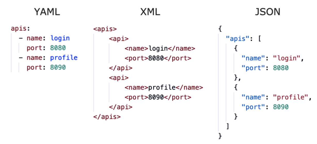 규칙에 맞게라고 했는데, 어떤 규칙을 가질까? 우선 json과 yaml 파일 형식에 대한 것은 대부분의 개발자가 알고 있으리라 생각된다. 그냥 어떤 정보를 표현하는 양식이라고 생각하면 된다. 아래 그림을 참고하자.