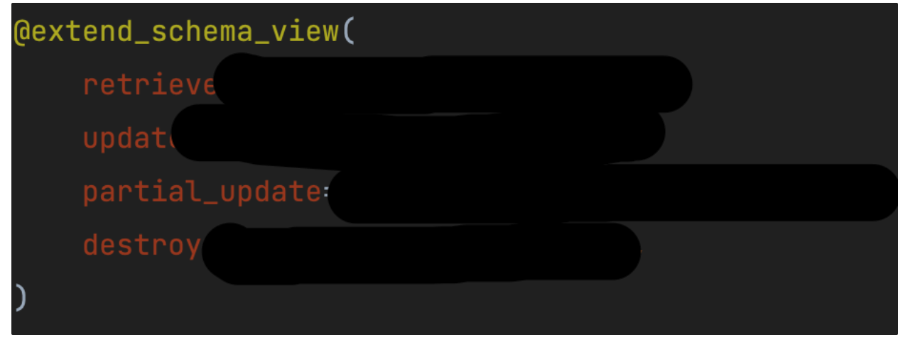 나는 최신 스펙을 적용하기 위해서 drf-spectacular를 사용했다. 그리고 프로젝트가 Viewset 기반으로 되어있어서 viewset 클래스 위에 @extend_schema_view를 달아서 사용했다.(이외에도 view나 함수에 적용하는 @extend_schema 등 데코레이터가 더 있다)