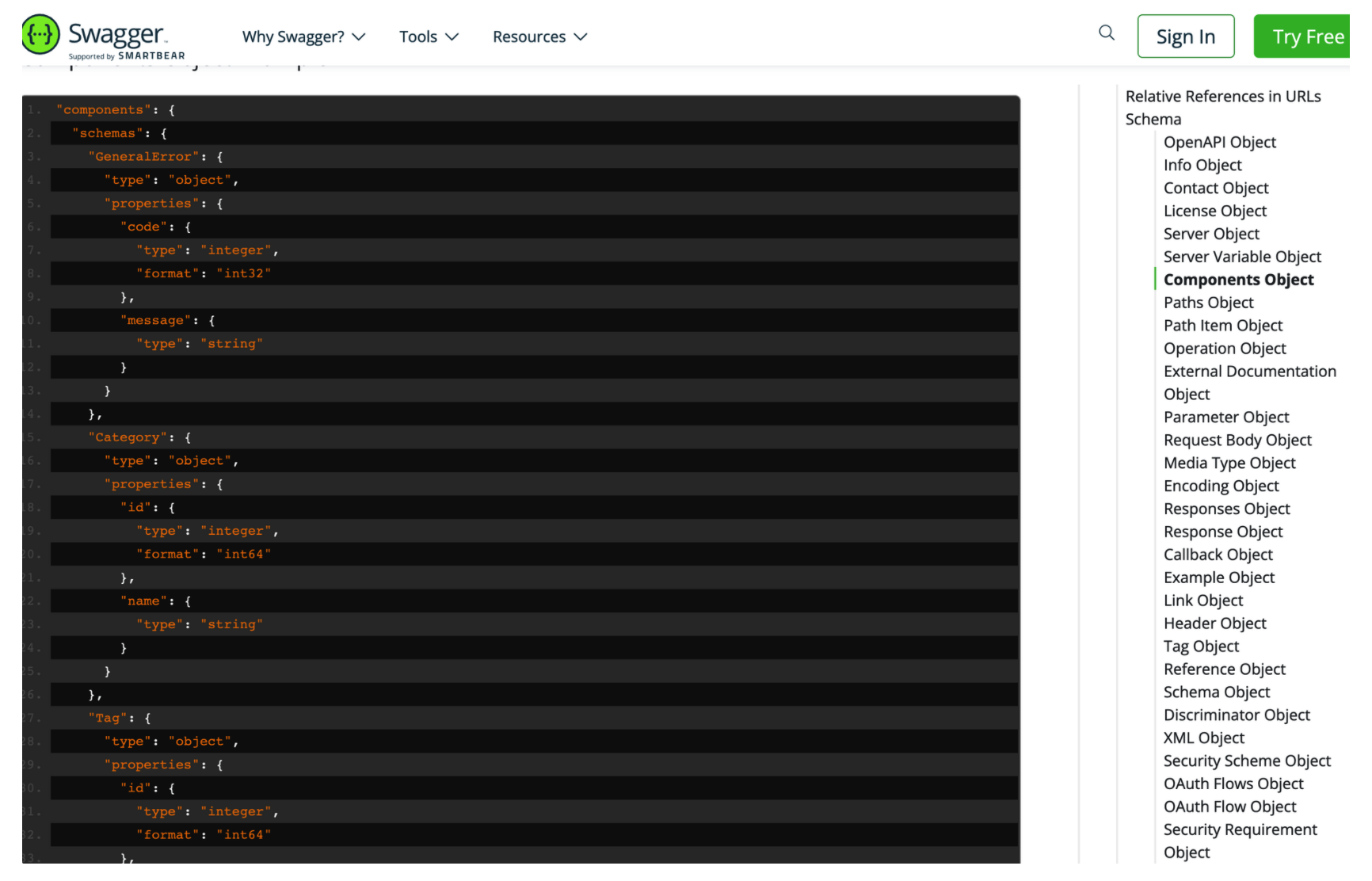 OpenAPI에서는 위 YAML 또는 JSON 방식으로 어떤 API 서비스의 구조를 표현한다. 어떤 API의 url, request, response, auth 등에 들어가야하는 정보가 무엇인지, 그 예시 값들은 어떤 값으로 지정할 것인지를 표현하는 것이다. 아래 참조3. 페이지의 Schema 파트를 보면, 어떤 API를 구성하는 정보들을 JSON 형식으로 표현한 Schema 파일의 일부를 볼 수 있다. 여러가지 Component로 이루어져서 하나의 거대한 파일로 서비스의 명세를 표현하는 것이다.
