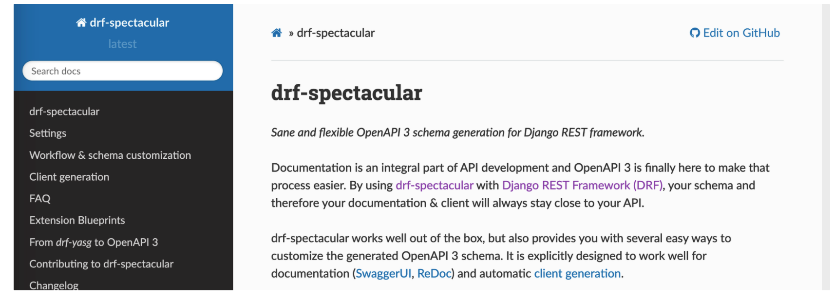 drf-spectacular는 Open API 3.0을 기반으로 한다. 원래 drf-yasg 라는 라이브러리도 있어서, 이 라이브러리는 OpenAPI 2.0을 기반으로 했다. 그래서 그런지 위 사진에 보면 From drf-yasg to OpenAPI 3라는 페이지도 있는 것을 볼 수 있다.