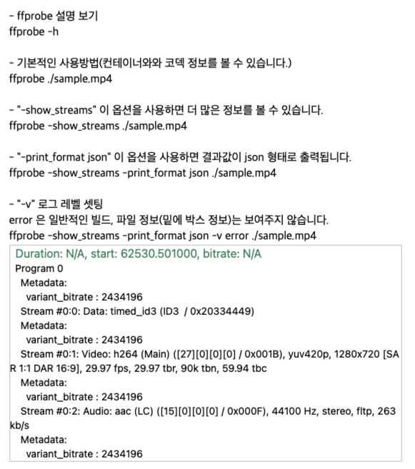 아래 참조 사이트를 보면 일반적인 ffprobe 명령어를 볼 수 있다.