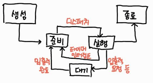 - 대기(blocked): 입출력, 이벤트 등에 의해 해당 작업이 완료되길 기다리는 상태