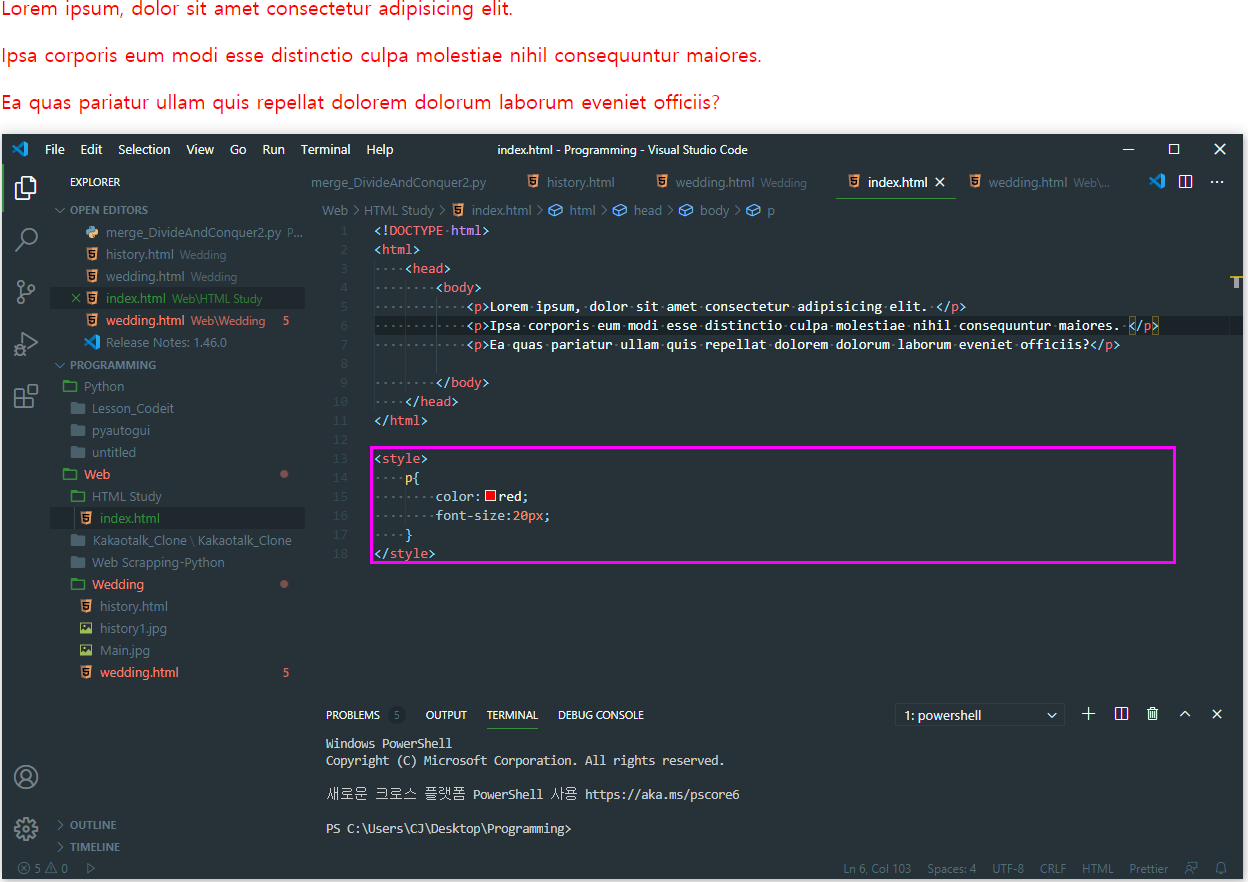 + 이렇게 <style> Tag를 적용하면, html 페이지가 여러개일 경우, <style> Tag를 html 페이지 파일마다 똑같이 붙여넣어줘야 한다. 페이지가 엄청 많다면? 사람이 할 짓이 아니다...