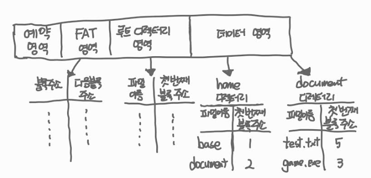 FAT는 파티션의 앞부분에 만들어진다. 실행 중 FAT는 메모리에 적재되어 블록 검색 속도를 향상시킬 수도 있다.