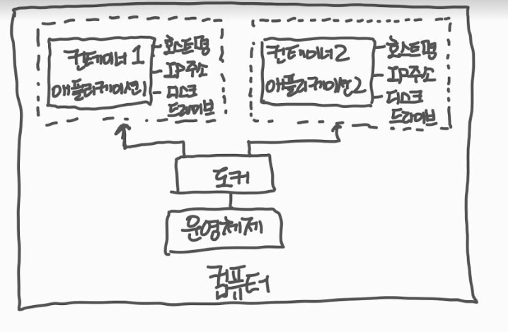 가상 머신 방법과 다르게, 각 컨테이너가 같은 운영체제는 공유하면서 개별 IP, 호스트, 디스크 드라이브를 갖는 형태이다. 이러면 가상 머신 방식에 비해 훨씬 빠르고 운영체제를 가상 머신 개수별로 관리해줘야하는 부담도 줄어든다.