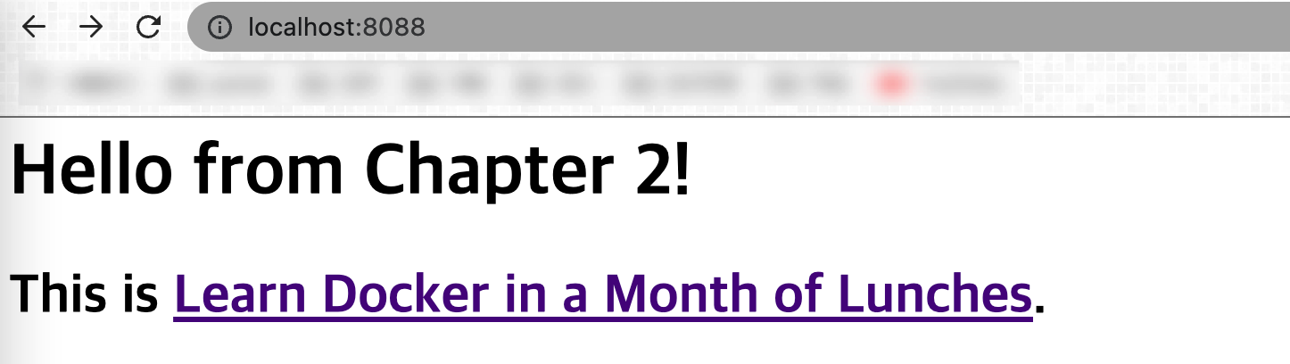 브라우저에서 localhost:8088/로 접속해보면 컨테이너에서 구동 중인 서버로 요청이 들어가서 간단한 HTML 응답 페이지가 출력되는 것을 확인할 수 있다. 다시말해 호스트 컴퓨터의 8088포트로 요청을 쏴서, 컨테이너의 80번 포트로 전달된 것이다. 위에서 배운 docker container logs {컨테이너 ID} 명령어를 통해 로그를 출력해보면 컨테이너로 요청이 정상적으로 들어간 것을 볼 수 있다.