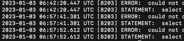 현재까지 해당 컨테이너에서 수집한 로그를 보여준다. 로컬로 사용하는 데이터베이스 컨테이너에 명령어를 입력했더니 에러가 났던 기록이 연속으로 출력됐다.