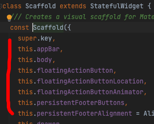 Flutter에서는 Nullable named parameter를 통해 class의 instance를 만들고 그 파라미터들을 인자로 받는 형식으로 만들어놨다. 예를 들어 Scaffold 위젯(클래스)는 클래스 파일에 들어가보면 다음과 같이 많은 파라미터들을 named parameter로 정의해놓았다.