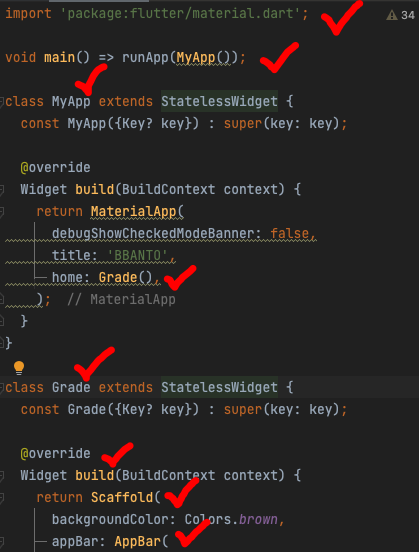 - main() => runApp: 프로젝트 구동 시 실행할 클래스를 지정한다.
