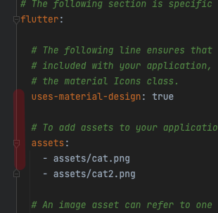 다만 여기서 주의할 점은 yaml 파일은 들여쓰기가 중요해서, 위쪽 uses-material-design과 들여쓰기가 맞는지 정확히 검사해야한다. 보통 그냥 주석을 풀면 불필요한 띄어쓰기가 한 칸 들어가있다!