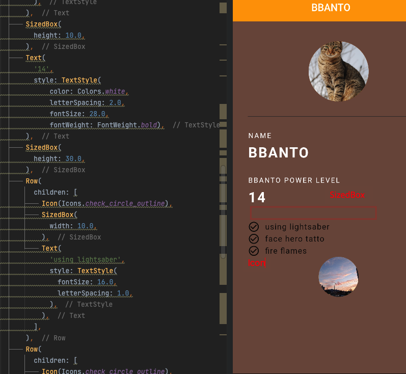 앱을 만드는데 필수적인 간단한 속성들에 대해 익숙해져본다. 각 위젯 클래스에 가보면 파라미터 값으로 다 나오지만, 기본적인 디자인을 위한 파라미터들은 여러 번 타이핑하며 익숙해지면 좋다.