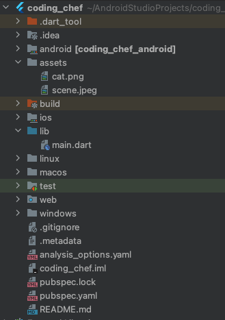 Android Studio에서 flutter project를 생성하면 아래 그림처럼 기본 구조를 만들어준다.