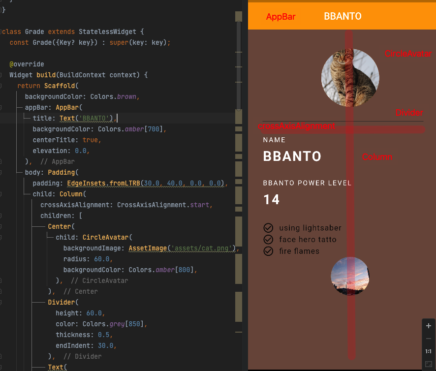 - Scaffold: 위젯 트리를 만들 수 있게 도와주는 위젯이다. 일단 backgroundColor, appBar, body 정도가 있다는 것만 이해해도 된다.