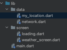 - my_location, network간 의존성이 없도록한다. 이 두 객체를 loading.dart에서 따로 불러와서 조합하는 방식으로 구성하면 각 객체의 독립성이 유지된다.