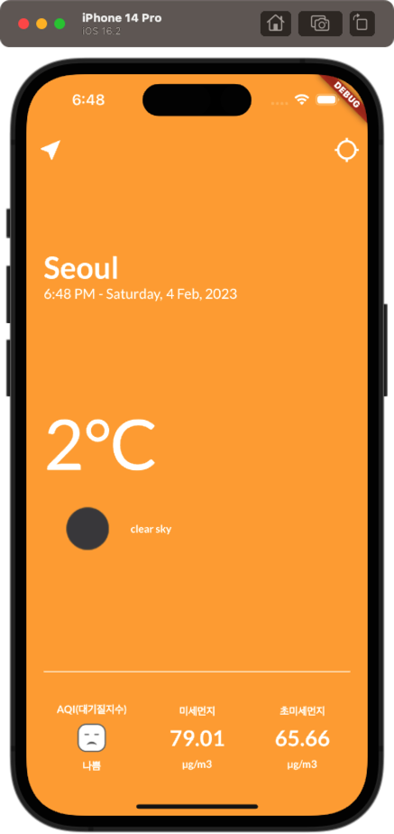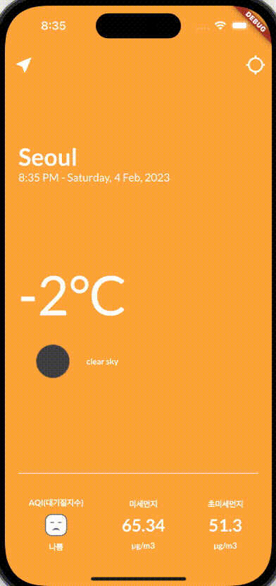 앞서 Loading 위젯에서 API 통신을 통해 JSON 형식으로 받아온 weatherData에서 description과 iconCode를 얻어왔다. 그리고 여기서 얻은 iconCode를 icon 그림을 얻기 위한 iconUrl에 동적으로 입력되도록 만들어주었다. 그리고나서 이렇게 얻은 결과를