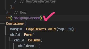 이제 inline if문이 적용된 Container 밑에 if(!isSignupScreen)을 추가해주고, 그 아래에 다른 Container를 추가하면된다. 어짜피 기본 구성은 같으니 코드는 생략한다.