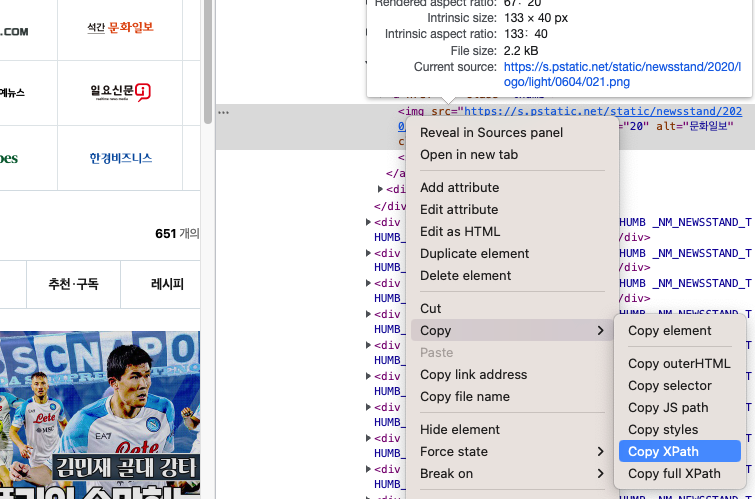 크롬 브라우저의 개발자도구에서 특정 element를 우클릭/copy/Copy XPath로 XPath 값을 얻어낼 수 있다.