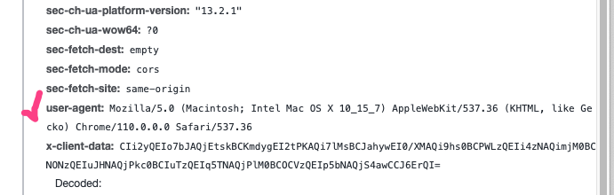 또는 개발자도구를 켜놓고 아무 사이트에나 접속하여 Header를 확인해보면 본인의 user-agent 정보를 얻을 수 있다.
