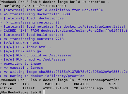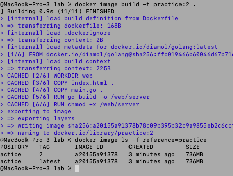 이미지를 그대로 build 했더니 736MB가 나왔다. 이름은 practice로 지었다.