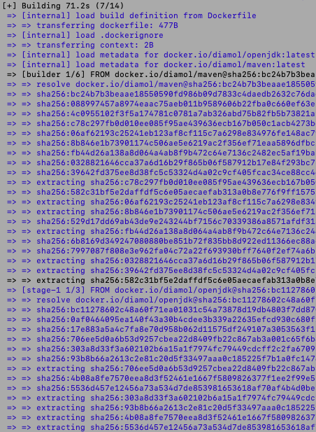 멀티 스테이지를 적용한 부분이다. 최종적인 산출물은 맨 마지막 FROM 명령어를 통해 지정된 부분이지만, 기반이 되는 파일들은 맨 처음 FROM 명령어에서 정의한 diamol/maven 쪽에서 가져온다는 의미이다. 이렇게 함으로써 해당 이미지가 builder에서 파일을 복사해올 뿐 컴파일된 JAR 파일은 직접 소유하지 않고 있어도 되는 구조가 된다. 불필요한 이미지 레이어의 중복이 없도록 만드는 것이다.