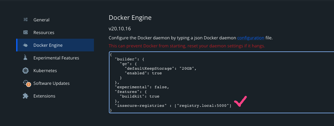 Insecure Registries에 registry.local:5000이 잘 등록된 것을 볼 수 있다.