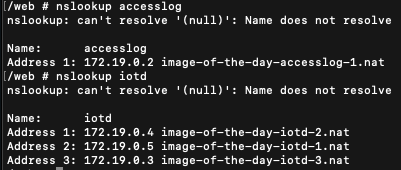 iotd 서비스의 컨테이너를 3개로 늘리고 애플리케이션 컨테이너에 접속한 뒤, nslookup으로 accesslog, iotd의 ip 주소를 서비스 이름으로 검색하였다. nslookup은 애플리케이션의 기반이미지에 들어있는 유틸리티다.
