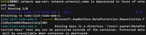 todo-web 서비스의 environment로 Database:Provider의 값이 Postgres를 가리키도록 하였다. 이 웹 앱은 Postgres의 기능을 기반으로 동작한다고 설정하고 알려주는 것이다. secrets 값으로 postgres-connection이라는 이름을 갖고 컨테이너 내의 /app/config/secrets.json 파일을 참조하는 비밀값을 지정해주었다. 데이터베이스의 Host, Name, Password 등이 여기에 저장될 것이다.
