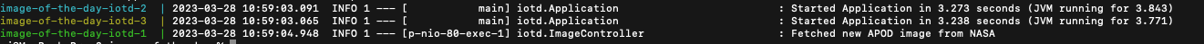 scale 옵션을 사용해서 iotd의 컨테이너를 3개로 늘릴 수 있다. --tail=1 파라미터는 각 iotd 컨테이너의 마지막 로그를 출력한다. 사이트를 여러 번 새고로침 한 뒤 로그를 출력하는 명령어를 입력해본다.