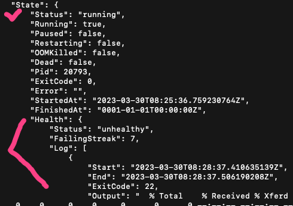 이상 상태가 발생하면 도커 API를 통해 보고된다. 그리고 docker container inspect 명령어로 healthcheck 로그를 살펴볼 수 있다. --last 1 옵션으로 가장 최근에 만든 container 1개를 살펴보고, --format '{{.ID}}' 옵션으로 해당 컨테이너의 ID값만 추출하여 바깥쪽의 docker container inspect 명령어에 인자로 전달하였다.