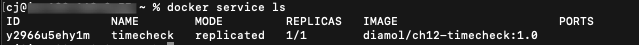 docker service create --name timecheck --replicas 1 diamol/ch12-timecheck:1.0