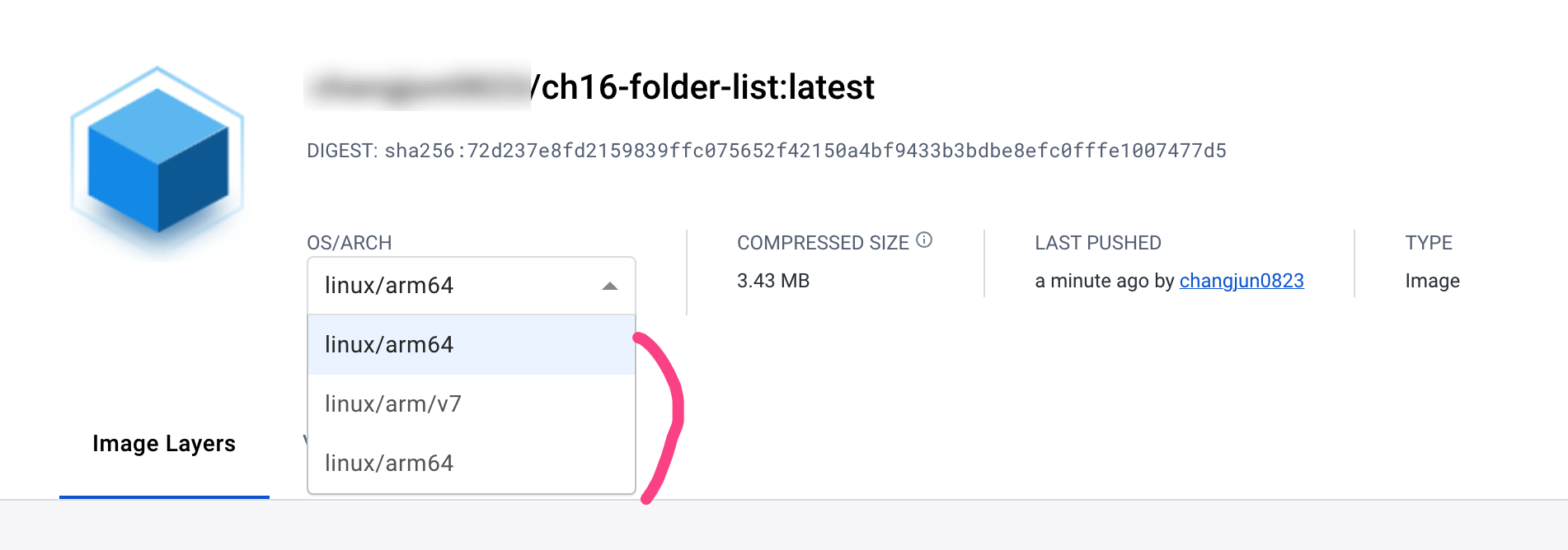 내 컴퓨터는 linux/aarch64라는 코드명을 갖는 아키텍처인 반면, 이미지는 linx-arm64용으로 태그를 달아서 빌드했기 때문에 linux/arm64 코드명의 아키텍처로 빌드되었음을 확인할 수 있다. (물론 둘다 ARM 계열이다.)