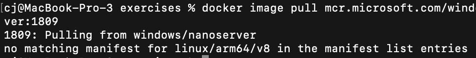 linux/arm64 아키텍처를 사용하고 있기 때문에 윈도우용으로만 제공되는 이미지는 다운로드 받을 수 없다고 나온다. 에러 메시지에 manifest list라는 이름이 나오는데, 이미지가 지원하는 아키텍처 이름 리스트 정도라고 보면된다. 뒤에서 다시 다룰 것이다.