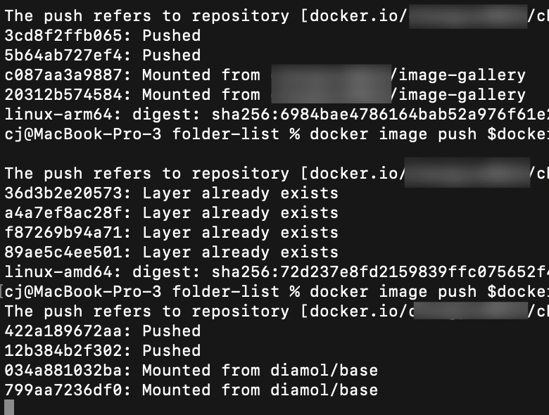 각 푸시 명령어 입력 시 이미지별로 존재하는 이미지 레이어에 대한 검사가 들어간다. 도커 허브상의 다른 레포지토리에 등록된 이미지 레이어라면 굳이 업로드를 하지않고 해당 레이어를 참조하는 것을 확인할 수 있다(Mounted from ... 부분들).