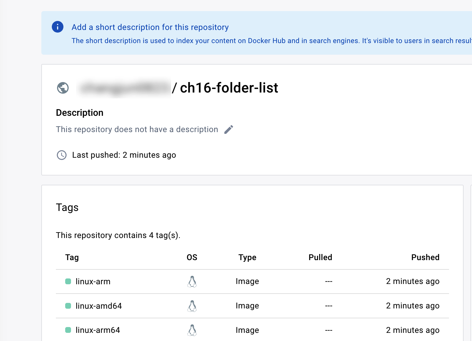 예를 들어 아래 그림에선 계정 이름/ch16-folder-list 라는 레포지토리 이름으로 작성된 이미지들이 docker image push 계정이름/ch16-folder-list 로 명령 시 푸시될 것이다.