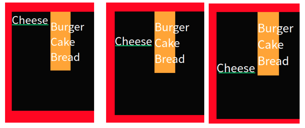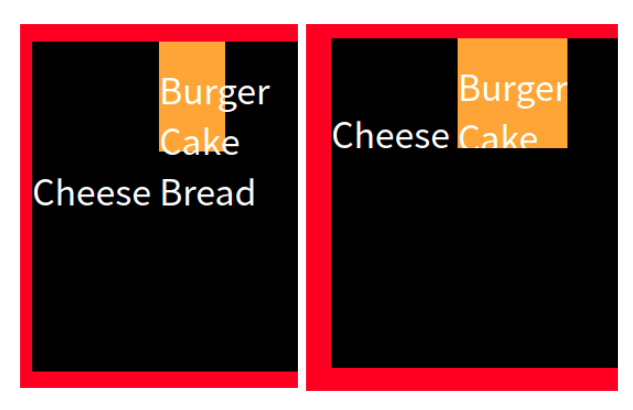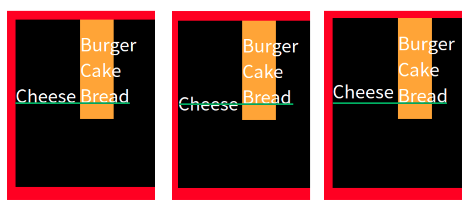 이때, parent-child 관계를 갖는 line 요소가 발생하면, 조건에 따라 align을 다르게 줄 수 있으며, 'vertical-align:attribute'을 통해 algin 위치를 지정한다. 다음은 black-box(Cheese text포함) 안에 orange-box(Burger Cakse Bread)가 child element로 포함되어 있고,