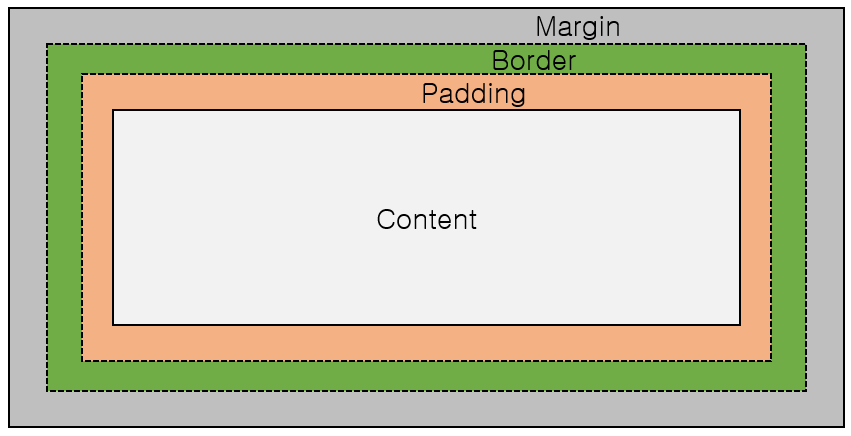 Box는 아래와 같이 구성된다. Contents를 Padding이 둘러싸고, 경계선인 border 외부에 Margin이 있다.