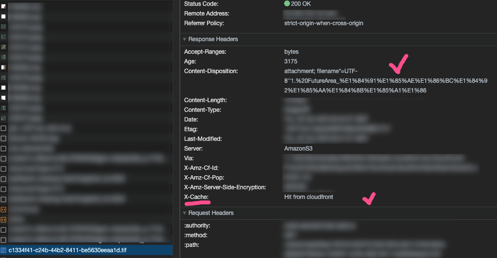 Content-Disposition이 변경되지 않는 원인은 CloudFront의 캐시 때문이였다! 위로 두번째 사진에서 X-Cache 헤더의 값이 hit from cloudfront라고 되어있는데, 이는 S3에 연결된 CloudFront에 의해서 오리진 위치(내가 CloudFront를 최초로 생성한 리전)에 업로드된 파일을 엣지 로케이션(오리진 외 다른 위치)에 캐싱해놓기 때문이다.