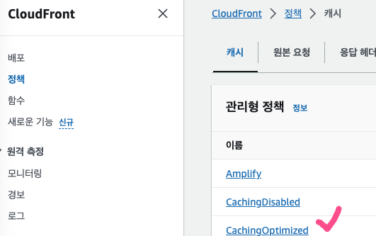 캐싱된 파일은 CloudFront의 정책 부분에서 TTL(Time To Live) 값에 따라 유지된다. CloudFront/정책/캐시/CachingOptimized에 들어가보면 최소, 최대, 기본 TTL이 설정된 것을 확인할 수 있다. 나의 경우 기본값이 86400(초)로 24시간으로 되어있었다!