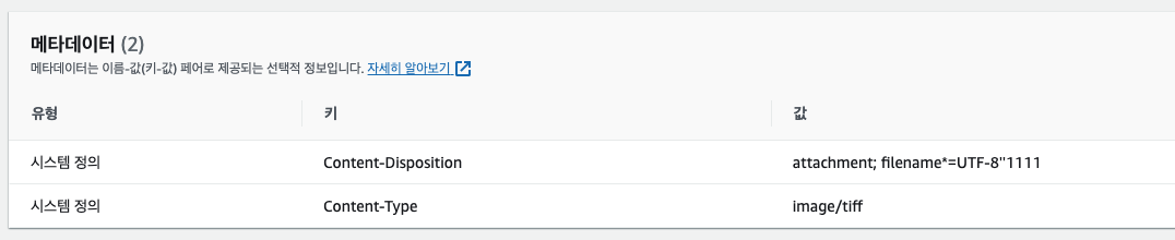 하지만 다운로드 시에는 다른 이름으로 저장될 수 있도록 해당 객체의 메타데이터 중 Content-Disposition 값을 변경해주었다. 참고로 보통 filename= {지정할 파일이름.확장자} 로 입력하는데, 한글의 경우 URL 형태로 인코딩하기 위해서는 filename*=UTF-8"{파일명}의 형태로 입력해주어야한다.