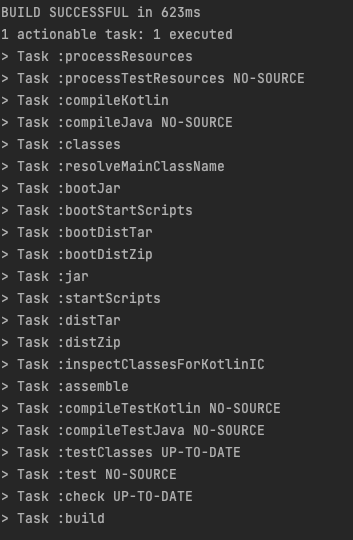 이후 clean, build를 하고 다시 실행하면 정상적으로 작동하는 것을 확인할 수 있다. 이는 빌드 시 아래 모든 tasks를 실행하는데, 여기서 bootJar task가 실행되면서 스프링부트로 실행할 수 있는 환경을 만들어주기 때문이다.