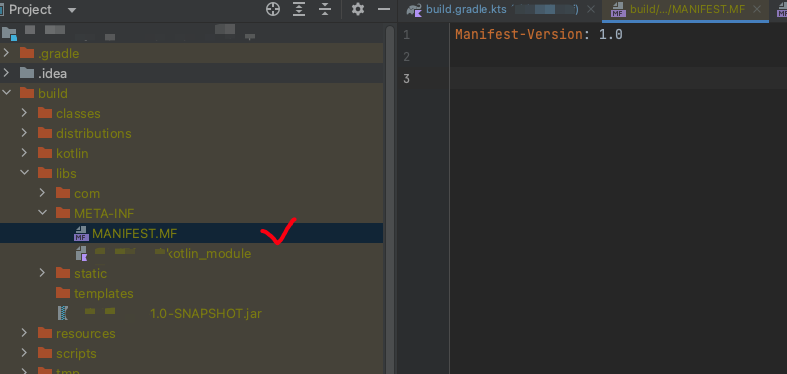 위에서 설명한대로 자바가 참조하는 매니페스트 파일에 과연 어떤 값들이 적혀있는지 확인해보기 위해서 build/libs/{프로젝트명}-1.0.SNAPSHOT.jar 파일에 접근했다. 그리고 이 파일에 tar -xf {파일명} 명령어를 입력해서 압축을 풀었다. ({파일명}을 직접 기입하지 말고 TAB 키를 눌러서 접근하는게 편하다.)