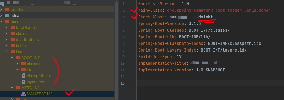 그리고 cat 명령어로 MANIFEST.MF 파일을 확인하거나, intellij에서 조회해보면 속성값들을 볼 수 있다. 아래는 springboot plugin 없이 실행한 뒤 MANIFEST.MF 파일을 열었을 때와 추가 후 열었을 때의 비교 사진이다.springboot plugin의 bootJar Task에 의해서 Main-Class, Start-Class 등의 여러 속성들이 추가되고 BOOT-INF라는 디렉토리도 추가된 것을 확인할 수 있었다.