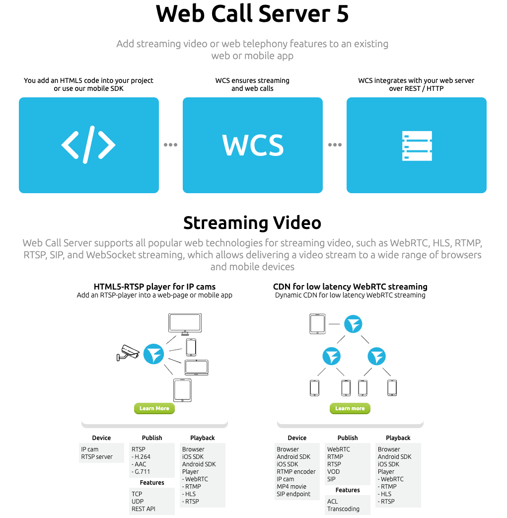 WCS(Web Call Server)는 Flashphoner라는 회사에서 제공하는 서버 이름이다. WebRTC 기술을 기반으로해서 실시간 비디오 영상 등을 전송하는 기능을 제공하는 서버라고 보면 된다. 이 서버를 infra로 실시간 스트리밍을 위한 서버를 구축할 수 있다. 다만 띄우는만큼 계속 돈을 지불해야한다.
